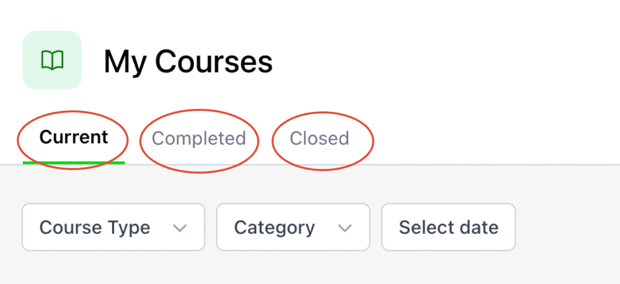 - Any cancelled or incomplete/expired courses will display in Closed.