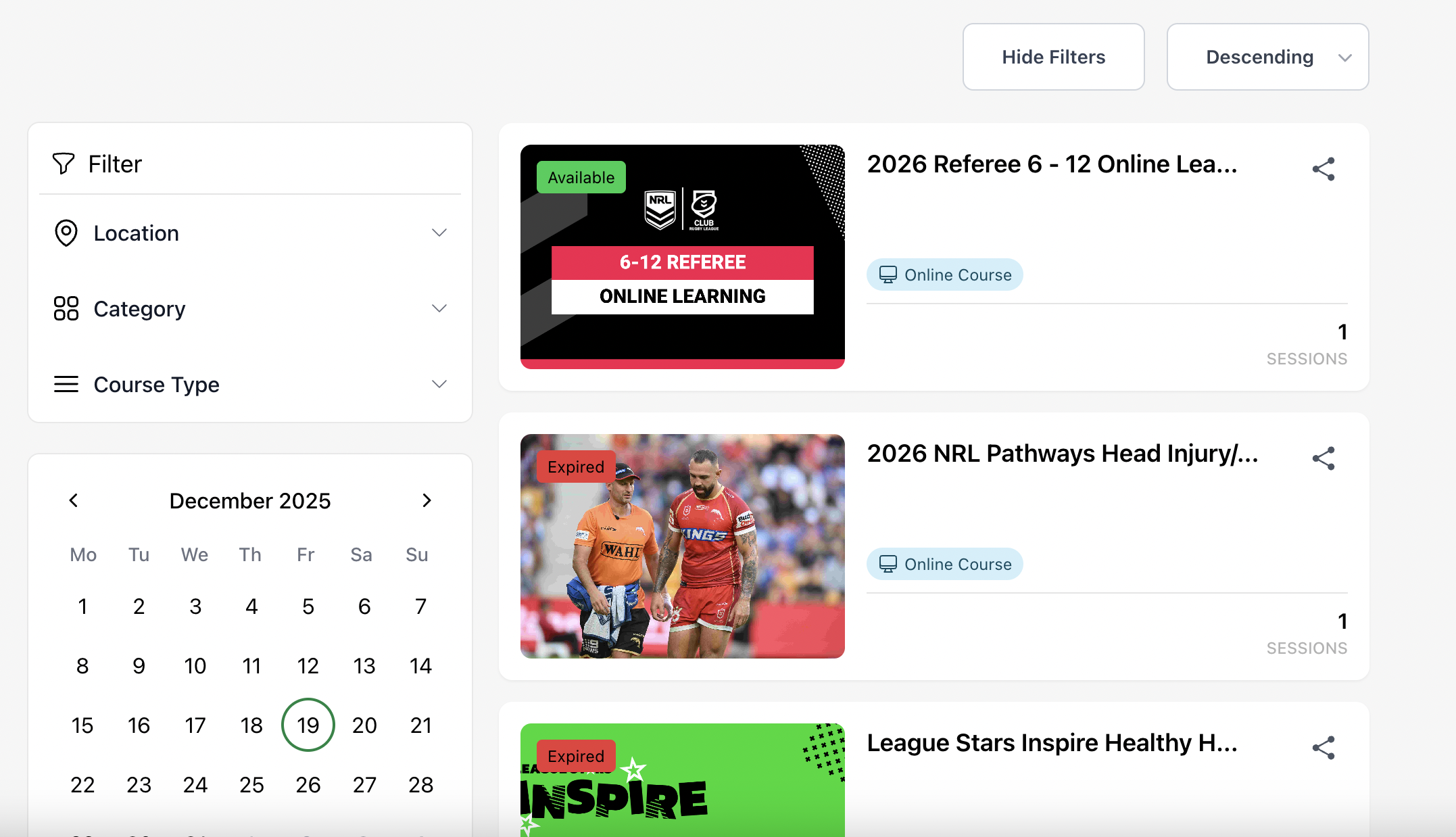 Filters will allow you to narrow your search based on Location, Course Category (e.g. Coach or Trainer), and Course Type (i.e. Online or Face to Face).