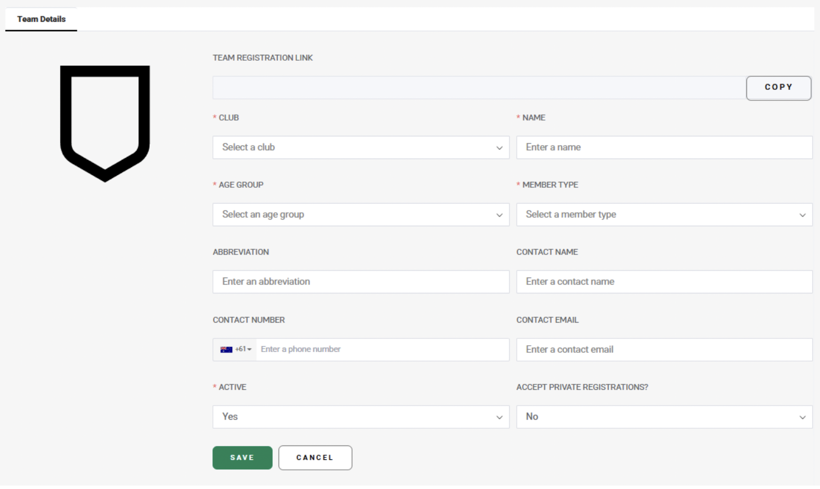 Team Registration Link – this will populate once the team has been created. The team must be allocated to a competition to allow registrations.